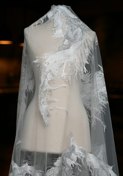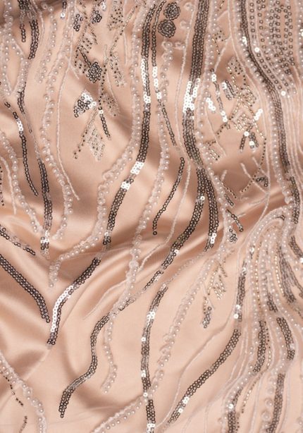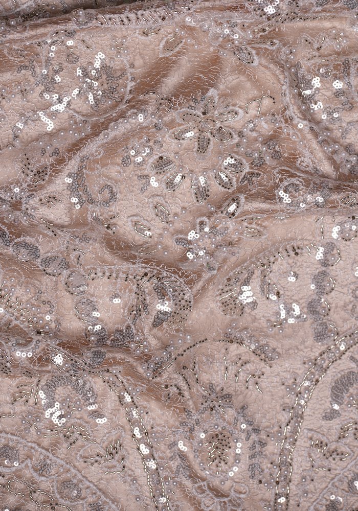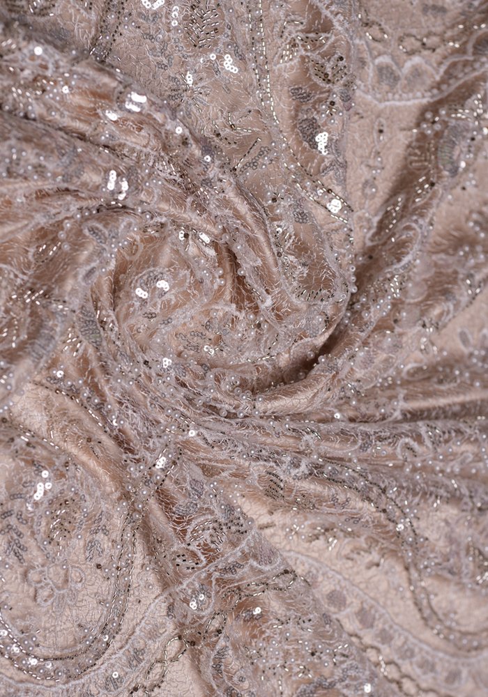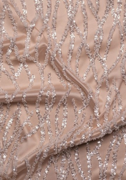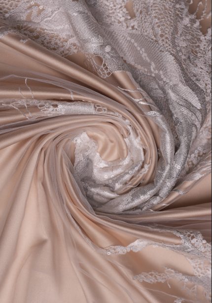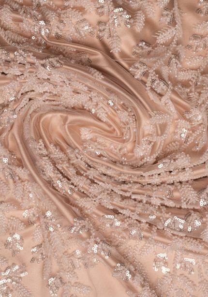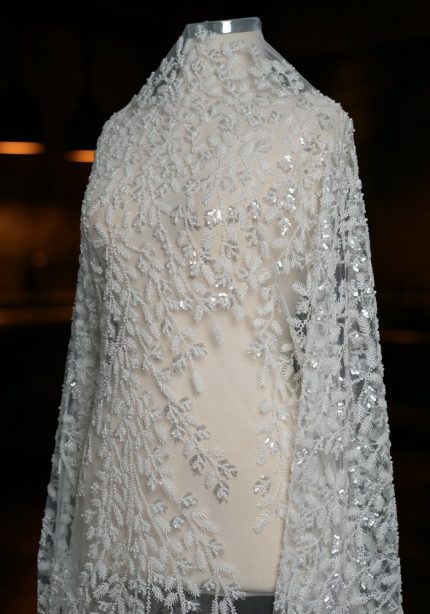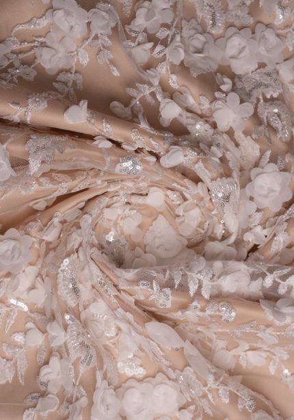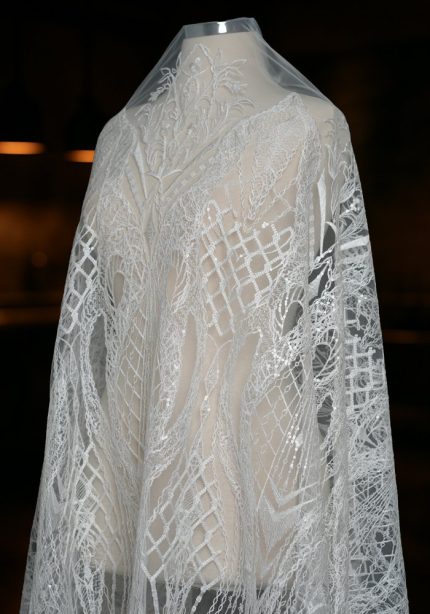 An exquisite French lace fabric embellished with intricate sequin floral motifs, offering a luxurious texture that blends modern allure with timeless glamour. With its delicate craftsmanship and refined finish, this fabric is ideal for creating graceful evening gowns, chic cocktail dresses, or statement accessories that captivate with every glance.