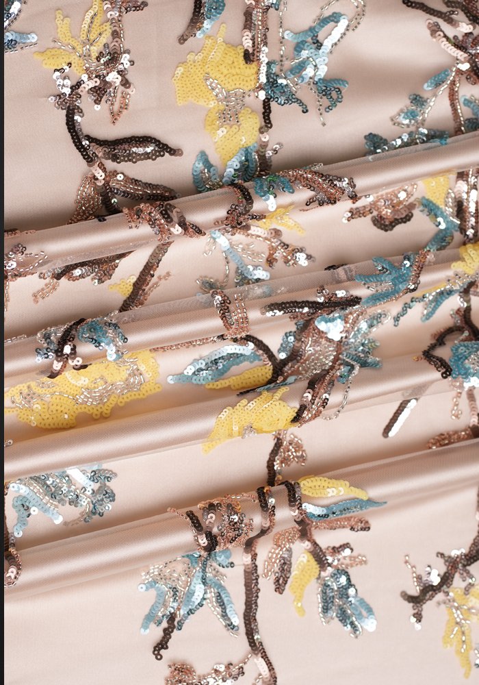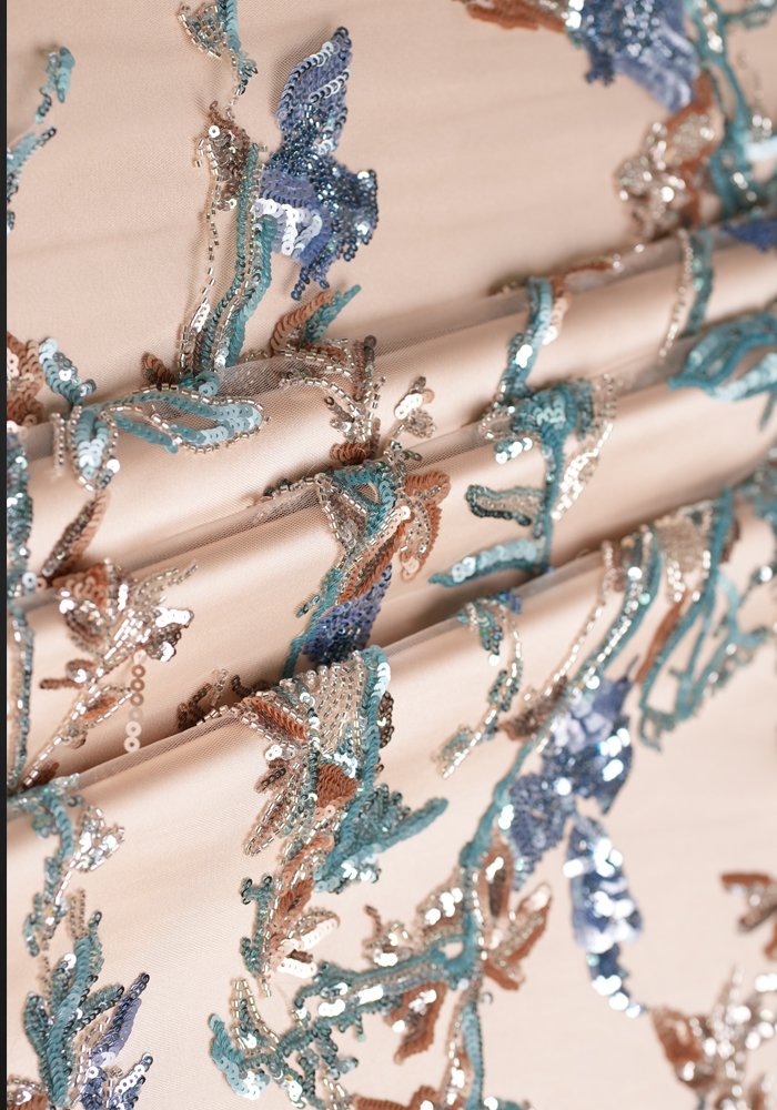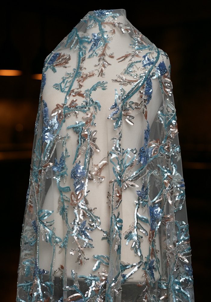 A refined tulle fabric featuring linear embroidery that resembles clean, straight lines—adorned with a mix of sequins, beads, and pearls. The design creates a structured yet delicate texture, offering subtle movement and shimmer with every step. Ideal for sophisticated gowns, elegant overlays, and couture pieces that blend minimalism with intricate detailing.