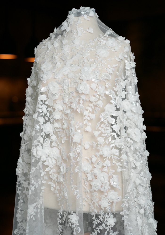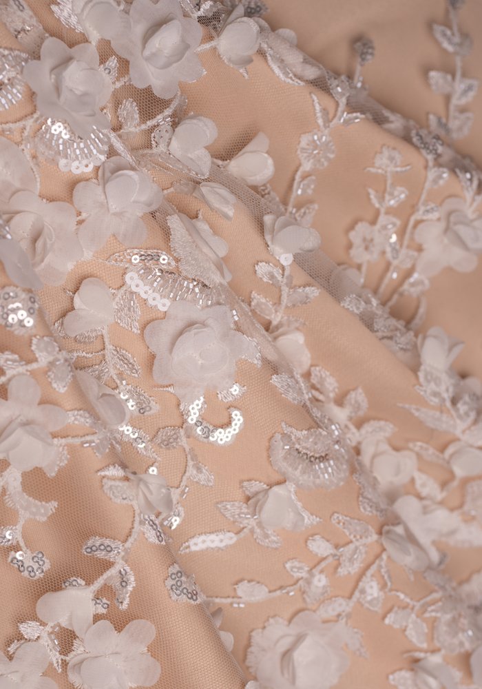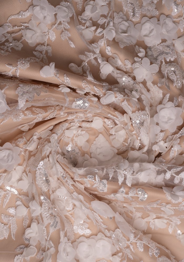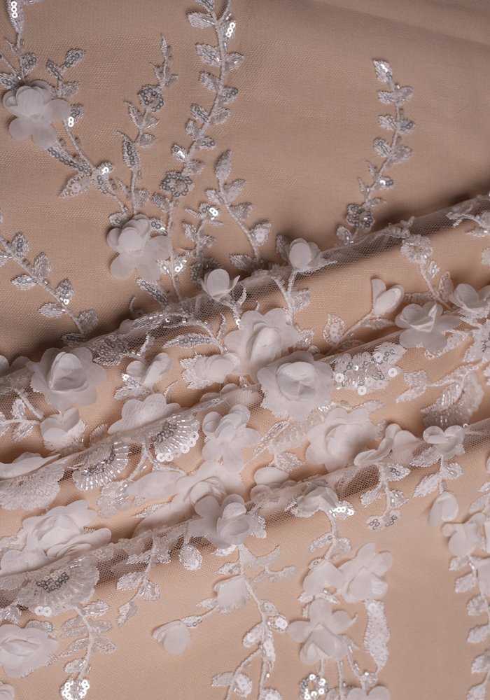 A captivating tulle fabric adorned with 3D leaf embroidery and shimmering sequins. The delicate tulle base offers a soft, sheer backdrop, while the raised textures and sparkling accents create depth and dimension. Perfect for gowns that demand elegance with a sculptural, high-fashion touch.