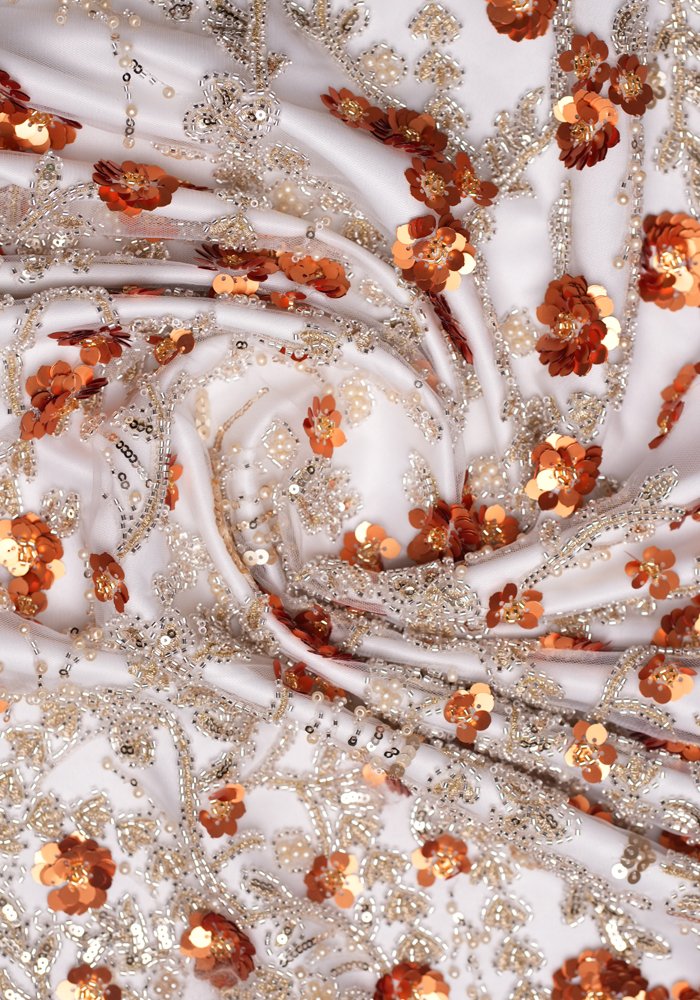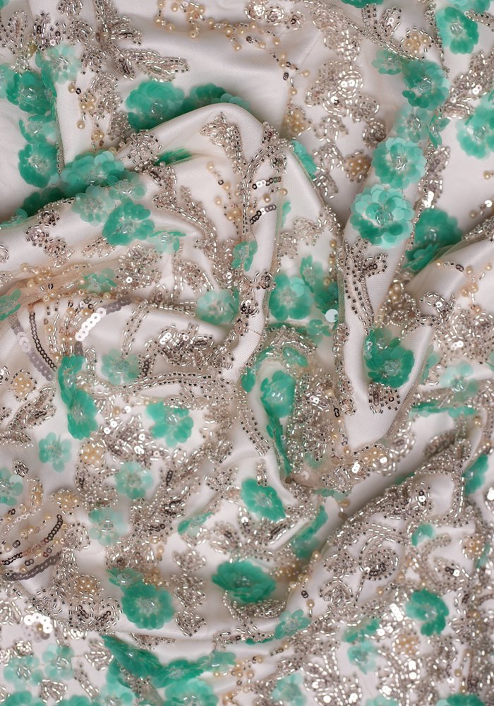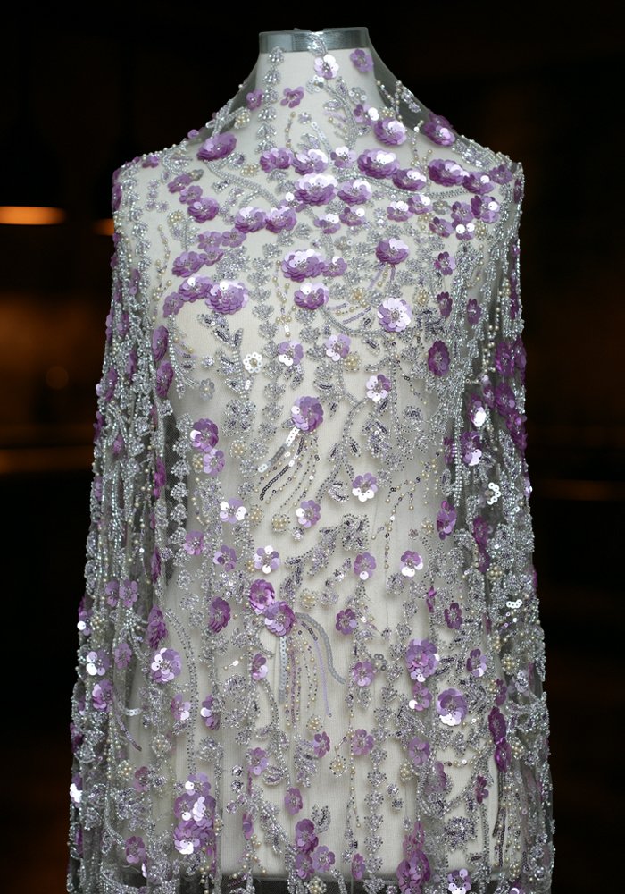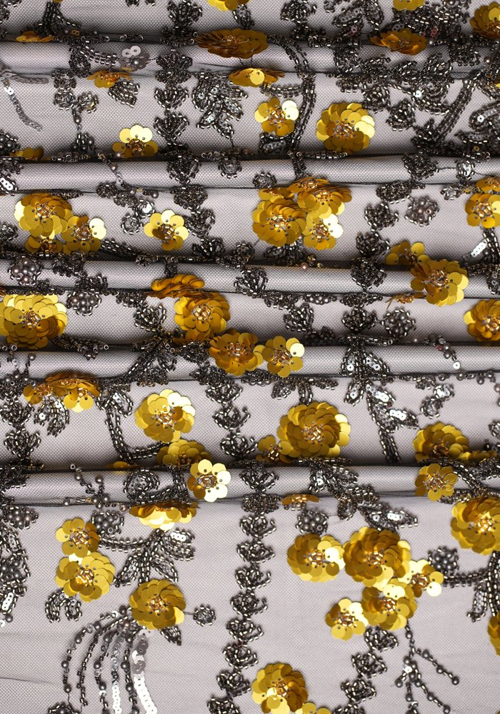 A refined tulle fabric featuring linear embroidery that resembles clean, straight lines—adorned with a mix of sequins, beads, and pearls. The design creates a structured yet delicate texture, offering subtle movement and shimmer with every step. Ideal for sophisticated gowns, elegant overlays, and couture pieces that blend minimalism with intricate detailing.