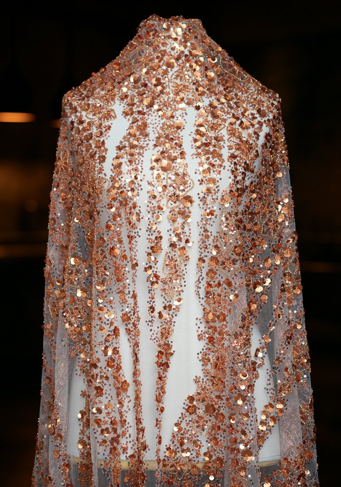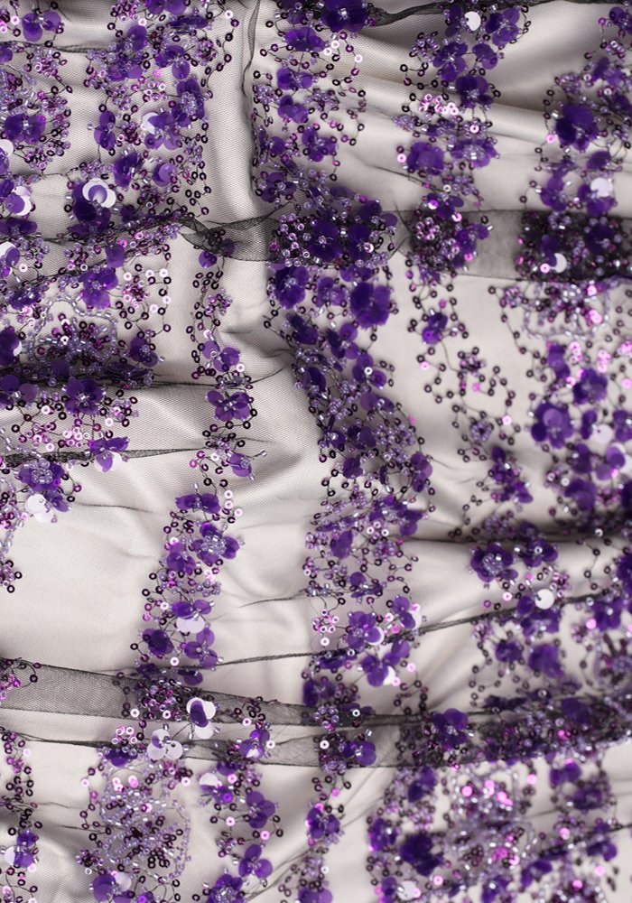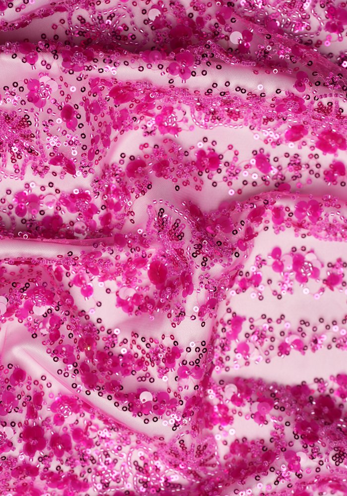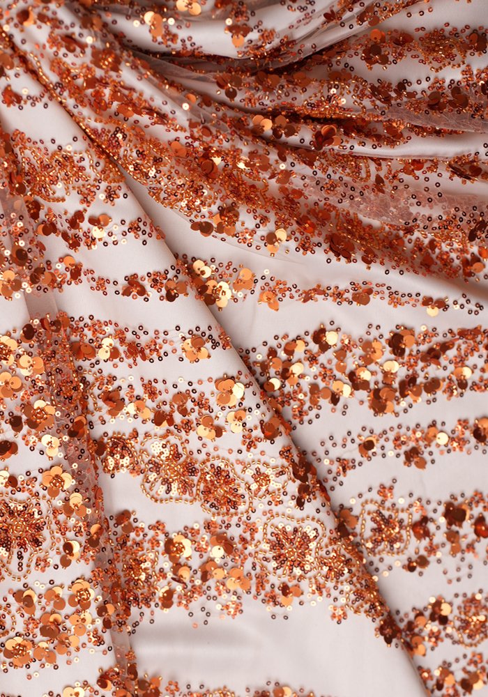 A refined tulle fabric featuring linear embroidery that resembles clean, straight lines—adorned with a mix of sequins, beads, and pearls. The design creates a structured yet delicate texture, offering subtle movement and shimmer with every step. Ideal for sophisticated gowns, elegant overlays, and couture pieces that blend minimalism with intricate detailing.