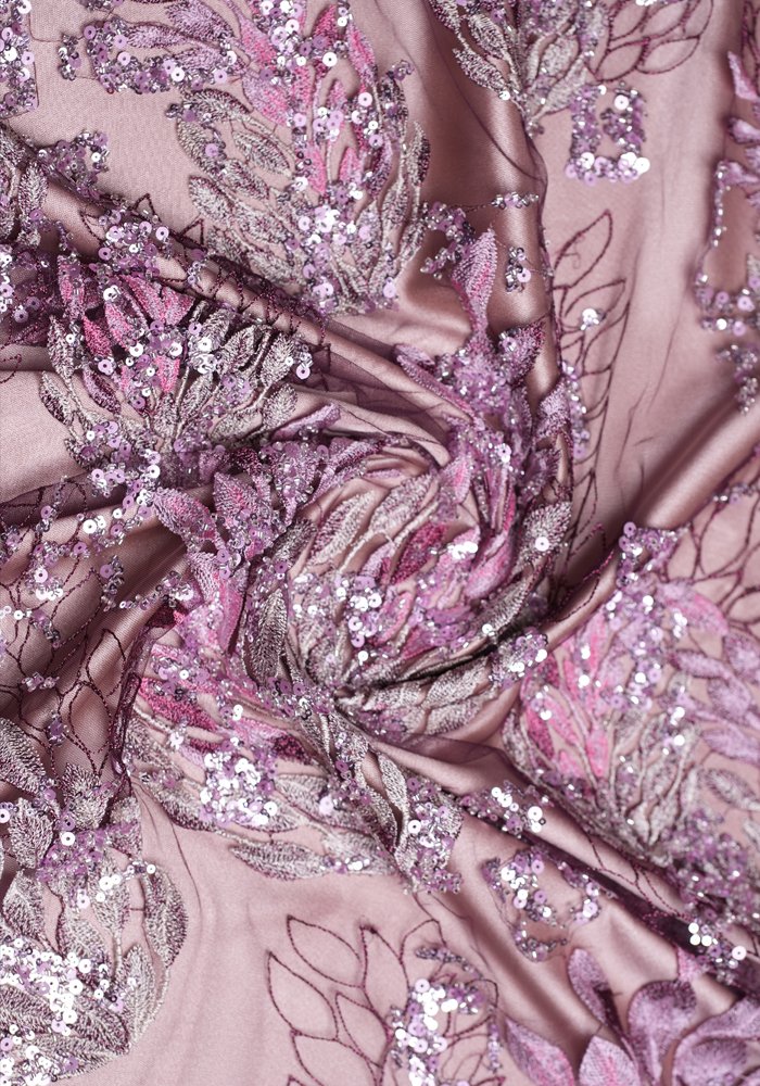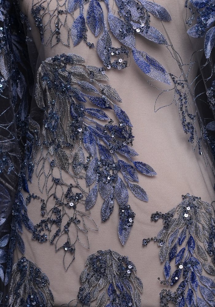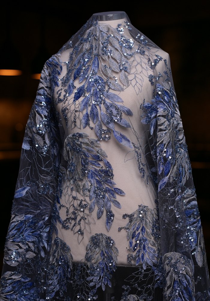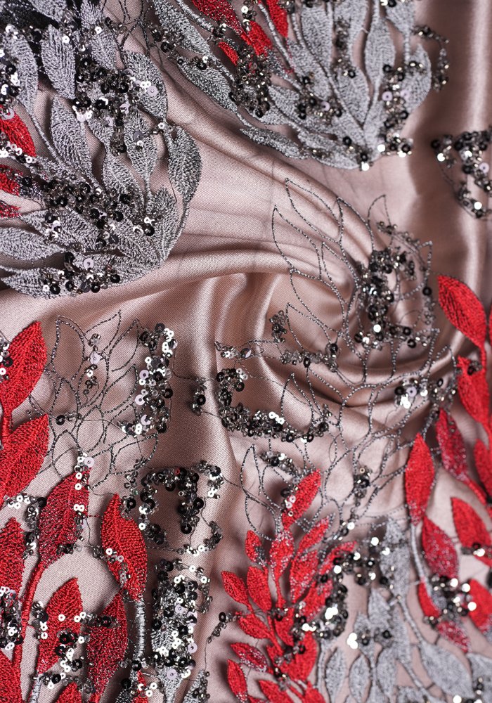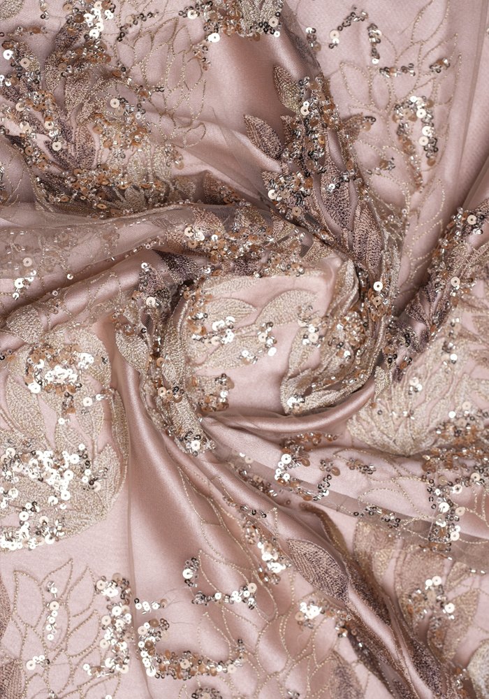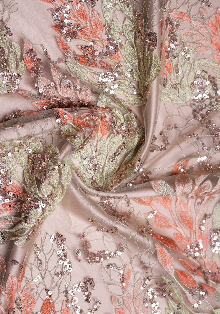 A delicate fabric featuring subtle leaf patterns embellished with light sequins and beads. This simple yet elegant design offers a refined look, making it a trendy choice for sophisticated fashion pieces.
