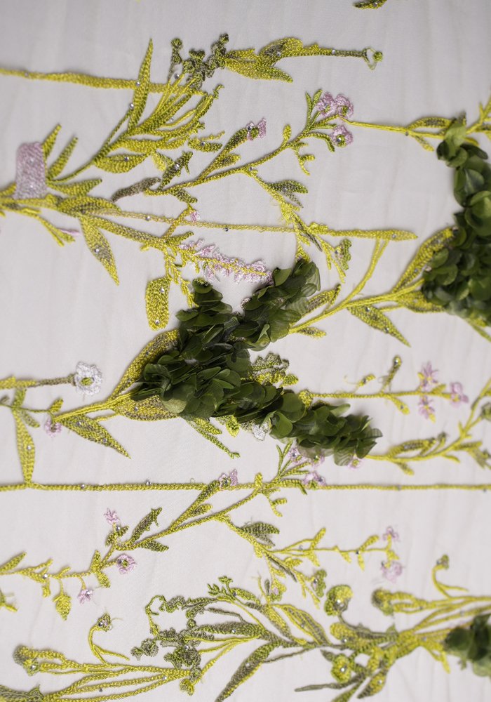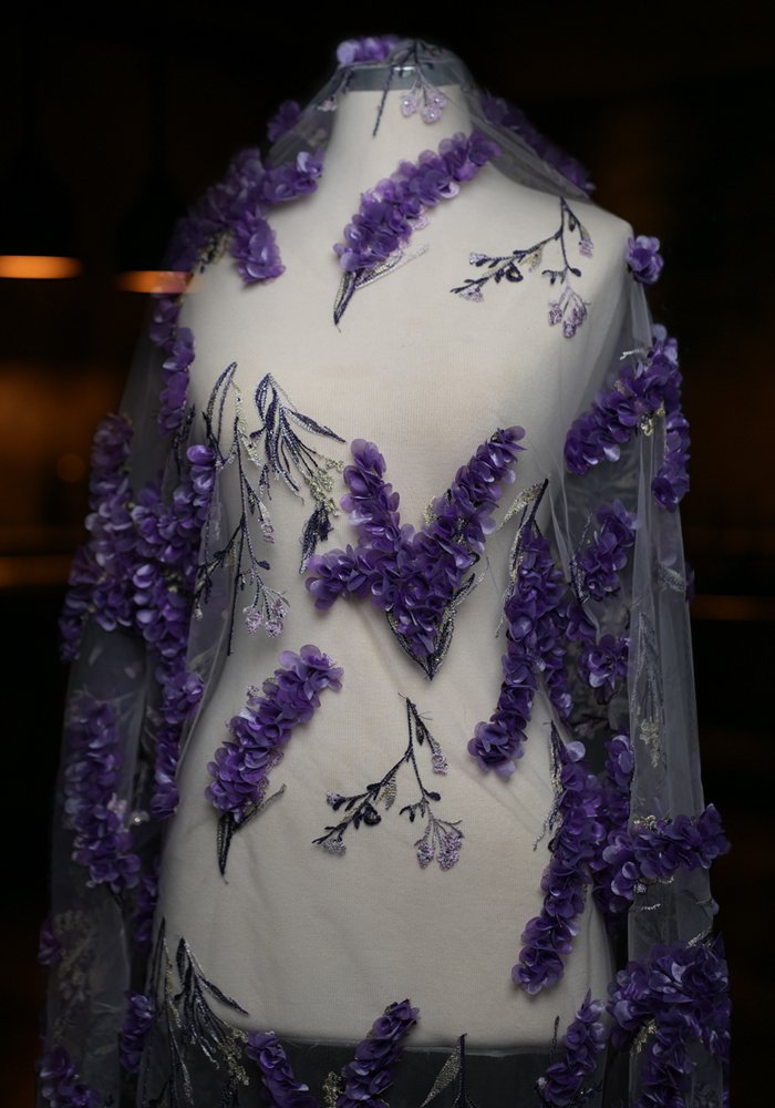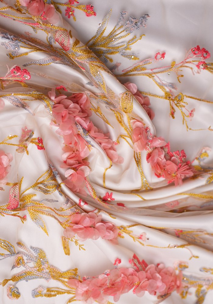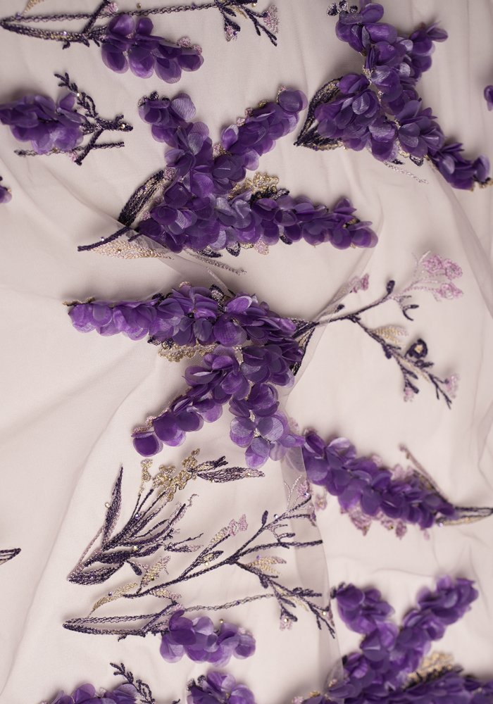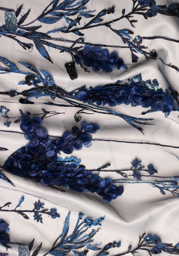 A refined tulle fabric featuring linear embroidery that resembles clean, straight lines—adorned with a mix of sequins, beads, and pearls. The design creates a structured yet delicate texture, offering subtle movement and shimmer with every step. Ideal for sophisticated gowns, elegant overlays, and couture pieces that blend minimalism with intricate detailing.