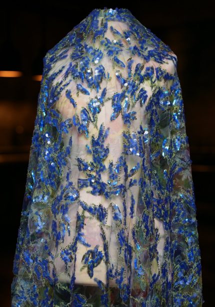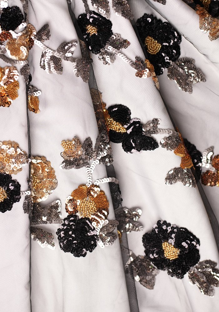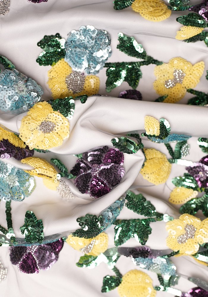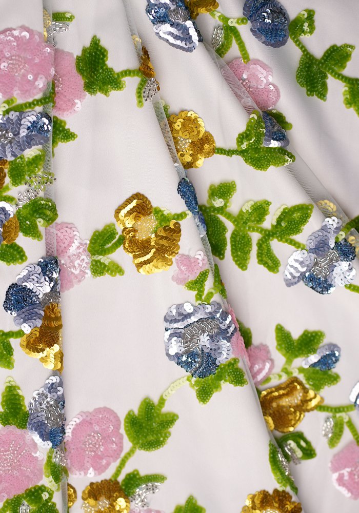 This fabric is embellished with intricate floral patterns made from beads and sequins. The sheer base highlights the fine detailing, while the subtle shimmer adds a refined elegance. Ideal for creating graceful gowns that combine softness, texture, and a hint of glamour without the use of bold color.