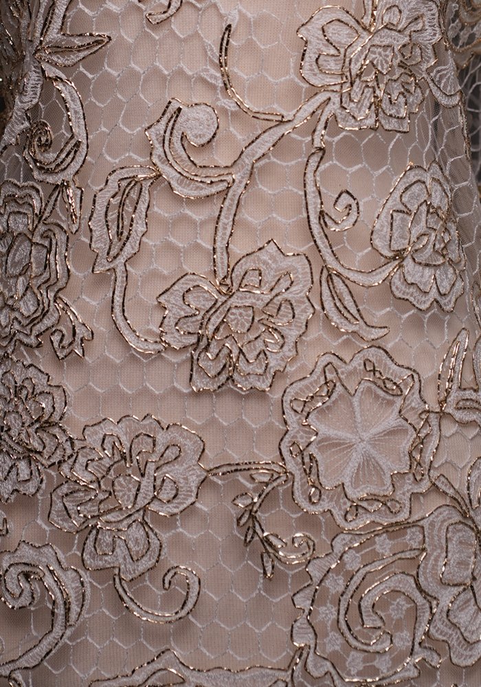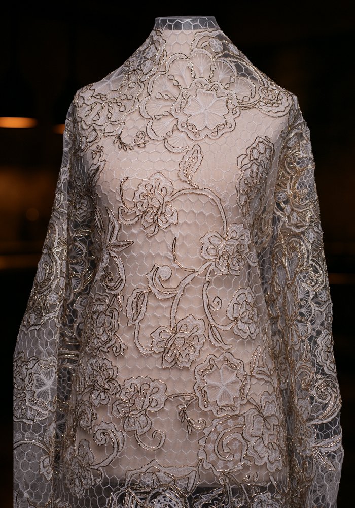 This fabric features a minimalist design with large floral patterns that stand out through their simplicity and scale. The clean layout emphasizes the beauty of each bloom without overwhelming the overall look, offering a refined and balanced aesthetic. Its graceful composition makes it a perfect choice for timeless gowns, elegant evening dresses, and sophisticated fashion pieces that aim for understated elegance with a bold touch.