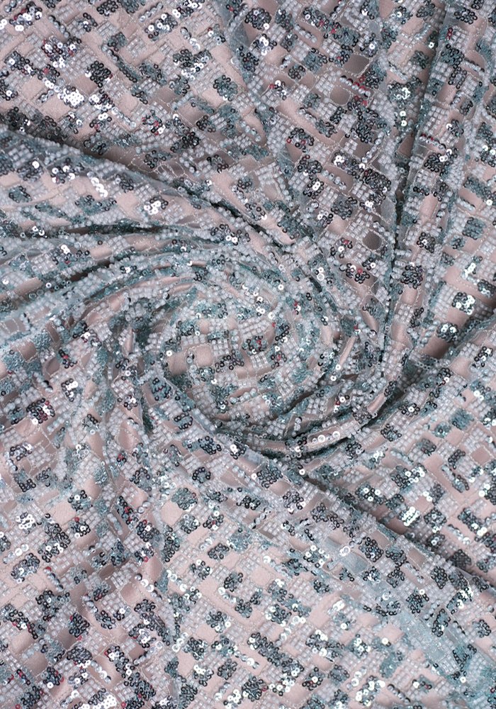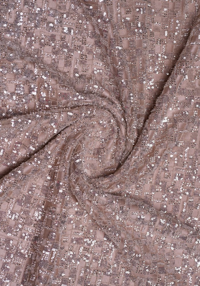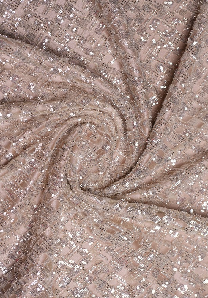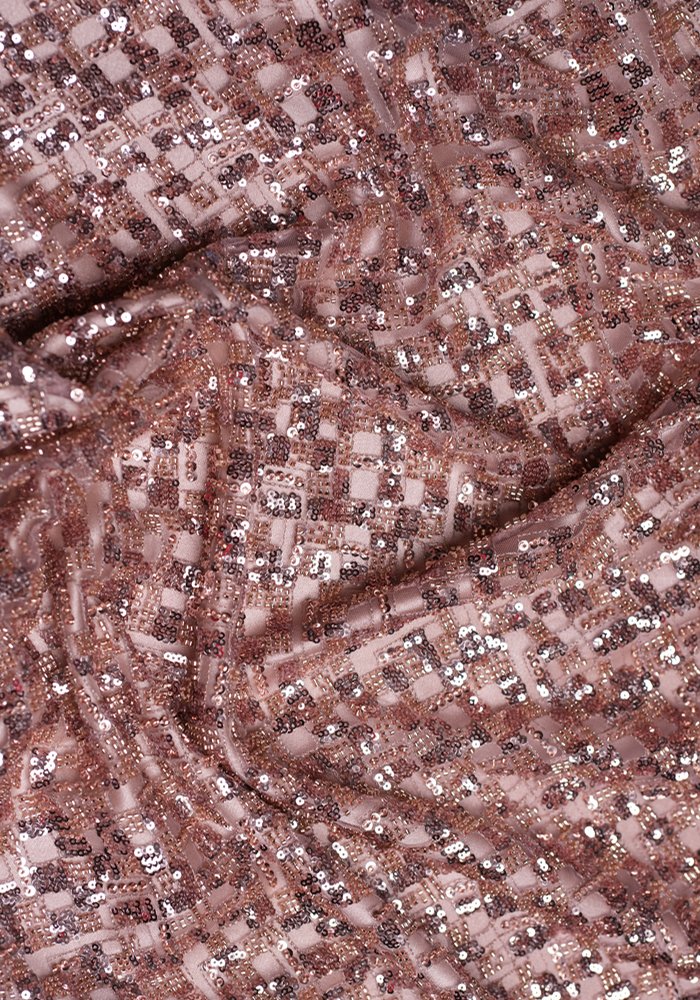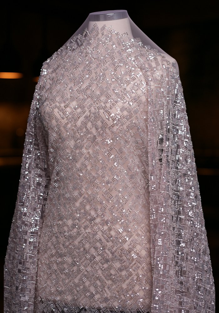 This elegant tulle fabric features soft, subtle embroidery adorned with sequins and beads. The delicate detailing adds graceful texture and light shimmer, offering a refined look suitable for creating timeless evening designs.